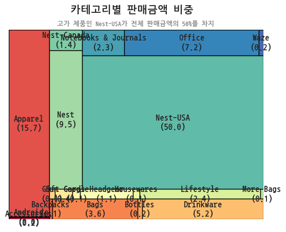 판매 금액 비중에서는 Nest 계열(Nest-USA, Nest, Nest-Canada) 제품이 과반수를 차지하는 것으로 나타났습니다. 반면, 판매 수량 비중에서는 Office, Apparel, Drinkware 등의 카테고리가 높은 비중을 차지했습니다. 이는 Nest 계열 제품이 상대적으로 고가이며 구매 주기가 긴 반면, Office, Apparel, Drinkware 등의 카테고리는 비교적 저렴하고 구매 빈도가 높은 품목이기 때문으로 해석됩니다. 이러한 상품 특성의 차이는 고객 분석 시 반드시 고려되어야 할 중요한 요소입니다.