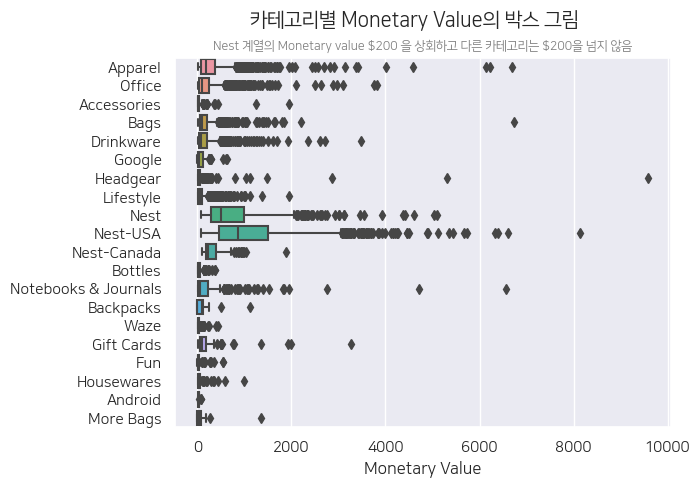 import seaborn as sns# 카테고리별 박스플롯sns.boxplot(x='Monetary', y='제품카테고리', orient='h', data=RFM)plt.xlabel('Monetary Value')plt.ylabel('')plt.suptitle('카테고리별 Monetary Value의 박스 그림')plt.title('Nest 계열의 Monetary value \$200 을 상회하고 다른 카테고리는 \$200을 넘지 않음',fontsize=9, color='gray')plt.show()