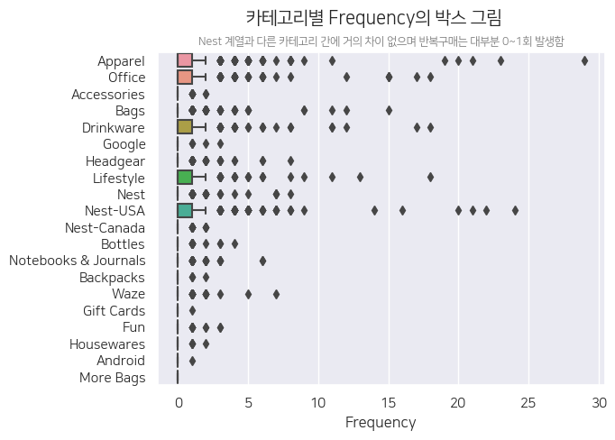 import seaborn as sns# 카테고리별 박스플롯sns.boxplot(x='Frequency', y='제품카테고리', orient='h', data=RFM)plt.suptitle('카테고리별 Frequency의 박스 그림')plt.title('Nest 계열과 다른 카테고리 간에 거의 차이 없으며 반복구매는 대부분 0~1회 발생함',fontsize=9, color='gray')plt.ylabel('')plt.show()
