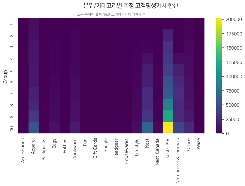 분위 내 카테고리의 고객평생가치 차지 비중을 확인하면, 추정 고객평생가치가 큰 10 그룹으로 갈수록 Nest 계열 제품의 비중이 평생가치 합산에서 차지하는 비중이 커지는 것을 확인할 수 있습니다. 이는 Nest 카테고리가 아닌 카테고리의 구매를 Nest 카테고리의 구매로 연결시키는 것이 더 많은 이익을 창출하기 위한 방법임을 알려줍니다.