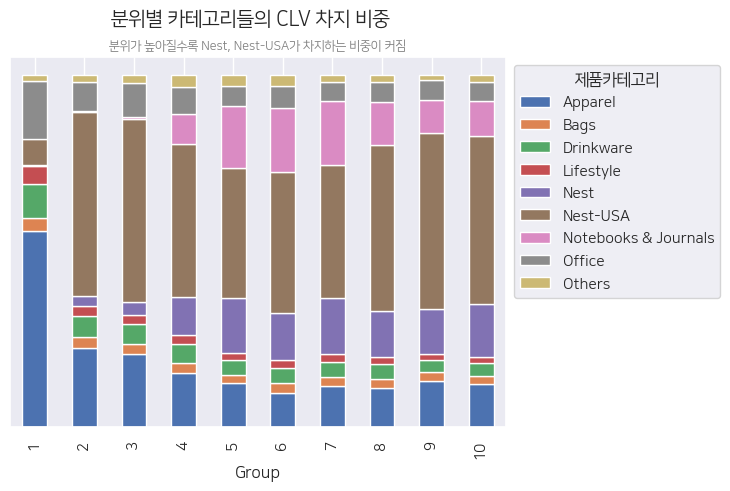 t8.plot.bar(stacked=True)plt.legend(title="제품카테고리", bbox_to_anchor = (1,1))plt.yticks([])plt.suptitle('분위별 카테고리들의 CLV 차지 비중')plt.title('분위가 높아질수록 Nest, Nest-USA가 차지하는 비중이 커짐',fontsize=9, color='gray')